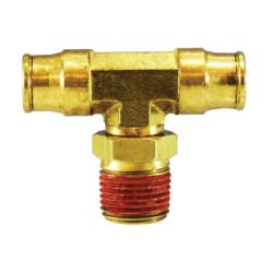 Swivel Branch Tee, Connection Size 1: 3/8 in, Connection Type 1: Tube OD, Connection Size 2: 1/4 in, Connection Type 2: Male NPTF, Connection Size 3: 3/8 in, Connection Type 3: Tube OD, Brass, 1/4-18 Thread, 0.56 in Hex, 2.1 in L, -10 to 200 deg F, Additional Information: 0.96 x 1.14 in Center to End, 0.180 lb Weight