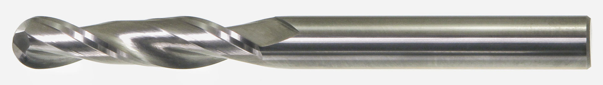 Solid carbide end mills run at extremely impressive feed and speed rates. In some cases, they can be run at 3x the rates of HSS end mills. Using solid carbide end mills results in better surface finish on the workpiece and extended tool life. Ball nose.