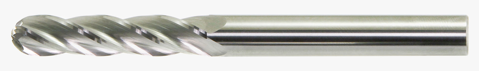 Solid carbide end mills run at extremely impressive feed and speed rates. In some cases, they can be run at 3x the rates of HSS end mills. Using solid carbide end mills results in better surface finish on the workpiece and extended tool life. Ball nose.